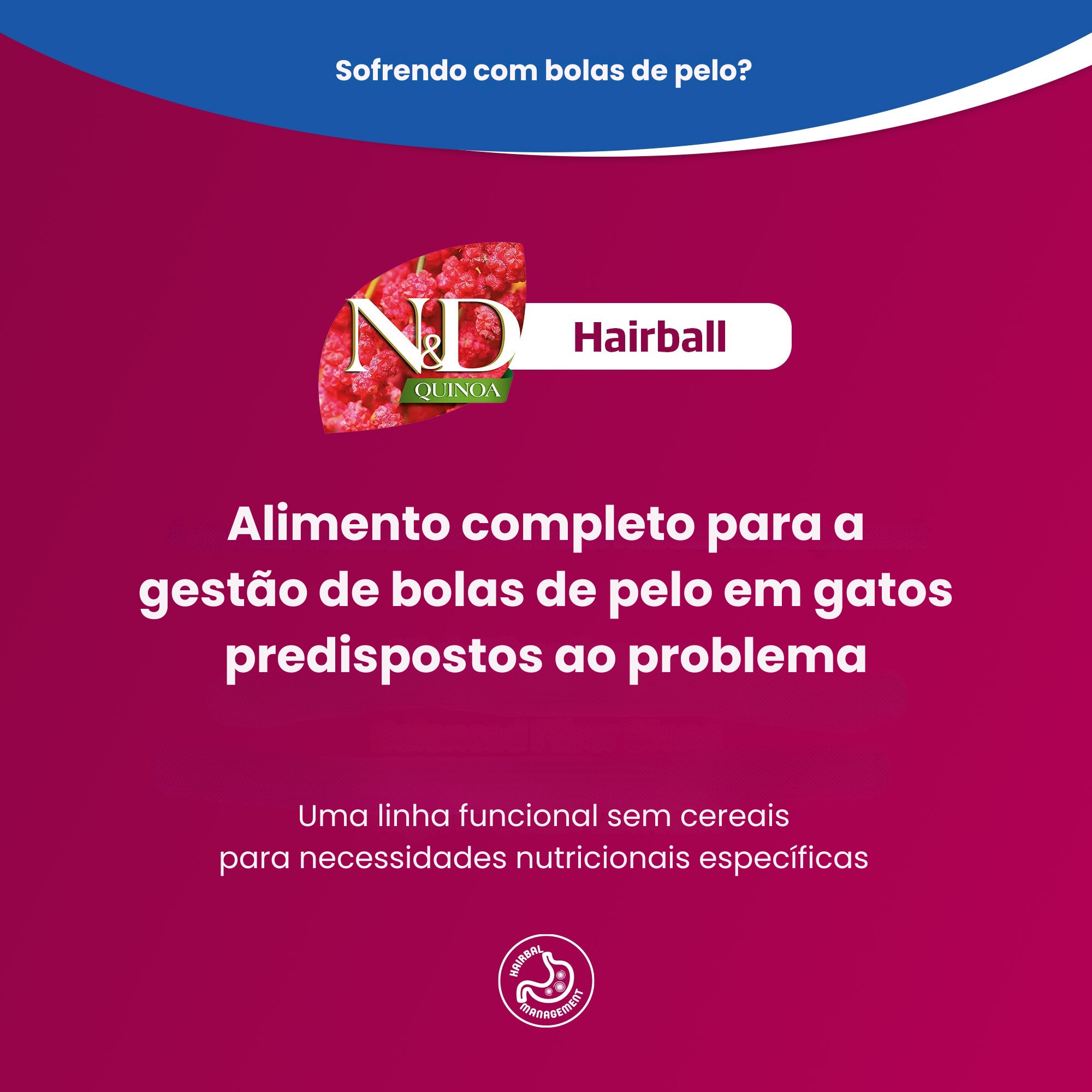 Com proteína nobre de pato associada à quinoa, coco e psyllium, fornece nutrientes de alta digestibilidade, fibras funcionais e energia equilibrada. O psyllium é fundamental para facilitar a passagem dos pelos pelo trato digestivo, enquanto a quinoa, por ser de baixo índice glicêmico, contribui para energia estável e manutenção do peso.