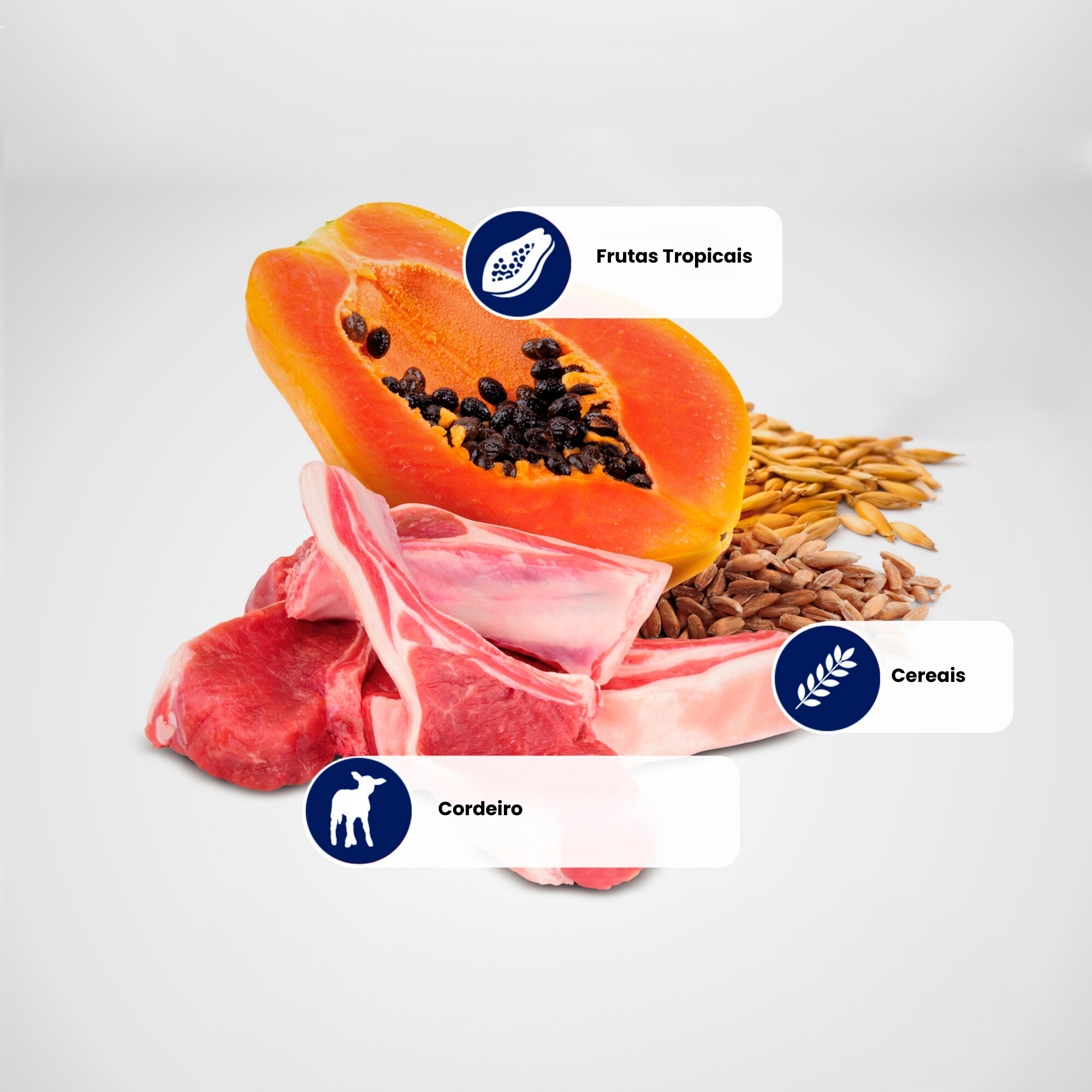 Sua fórmula combina a proteína nobre do cordeiro, altamente digestível, com frutas tropicais selecionadas como mamão, manga e kiwi. Essa combinação fornece fibras naturais, antioxidantes e vitaminas que favorecem a digestão, fortalecem a imunidade e contribuem para o bem-estar geral.
