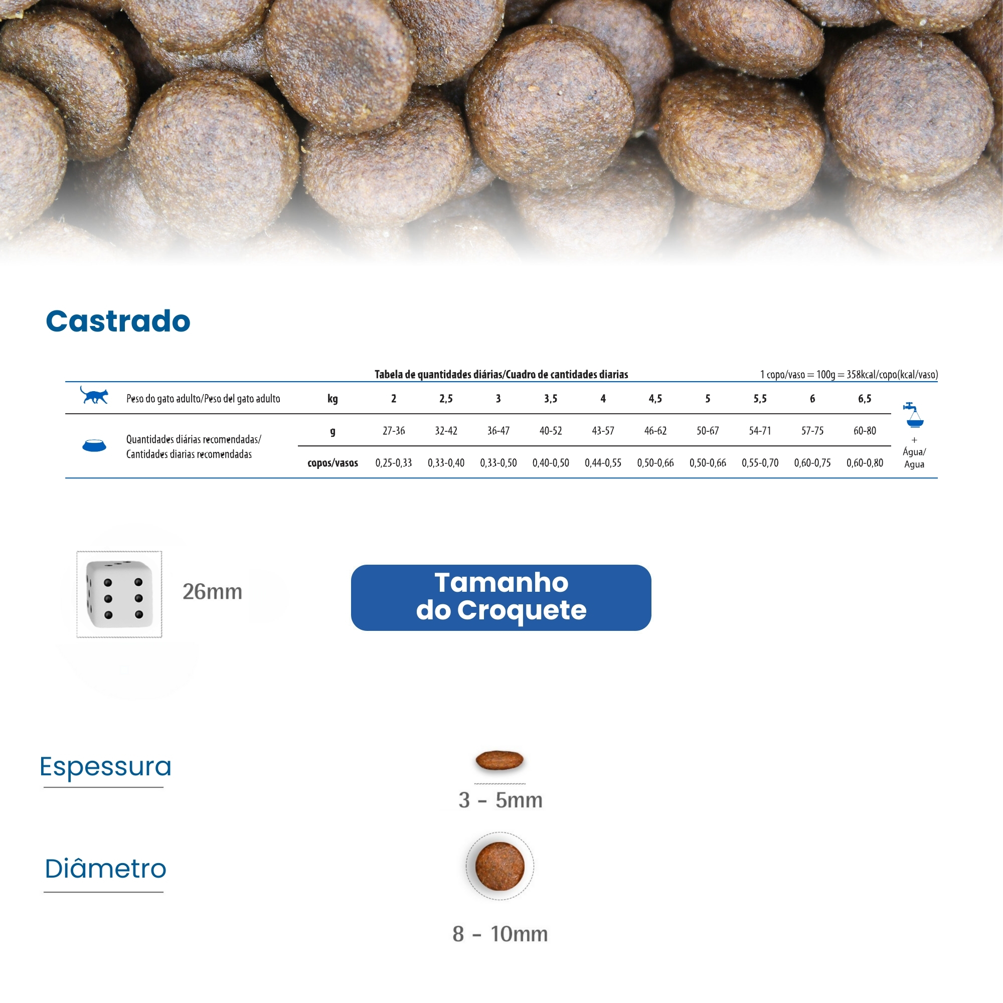 Com teores calóricos controlados e carboidratos de baixo índice glicêmico, ajuda no controle do peso corporal, prevenindo o excesso de gordura. As fibras naturais promovem saciedade, enquanto os ácidos graxos essenciais (ômega 3 e 6) mantêm a pele saudável e a pelagem brilhante.